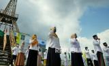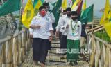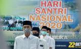 Sejumlah santri yang tergabung dalam Laskar Santri Nusantara dan Pergerakan Mahasiswa Islam Indonesia (PMII) Salatiga mengikuti kirab dalam rangka memperingati Hari Santri Nasional 2020 dengan menerapkan protokol kesehatan COVID-19 di kawasan Danau Rawa Pening, Radesa Wisata Tuntang, Kabupaten Semarang, Jawa Tengah, Kamis (22/10/2020). Kegiatan tersebut mengusung tema (FOTO : Republika/Bowo Pribadi)