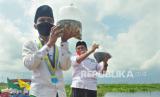Santri yang tergabung dalam Laskar Santri Nusantara menabur benih ikan di perairan Rawapening, di wilayah Kecamatan Tuntang, Kabupaten Semarang, Kamis (22/10). Kegiatan konservasi sumber daya perikanan ini dilaksanakan dalam rangka puncak peringatan Hari Santri Nasional tahun 2020. (FOTO : Republika/bowo pribadi)