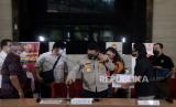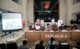 Konferensi pers penetapan tersangka kasus kebakaran Kejaksaan Agung di Mabes Polri, Jakarta, Jumat (23/10). Polri menetapkan delapan orang tersangka kasus kebakaran Gedung Utama Kejaksaan Agung. Menurut polisi, kebakaran gedung tersebut terjadi karena kelalaian kedelapan orang tersebut.Prayogi/Republika. (FOTO : Prayogi/Republika)