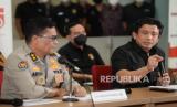 Direktur Tindak Pidana Umum (Dirtipidum) Bareskrim Polri Brigjen Ferdy Sambo (kanan) didampingi Kepala Divisi Humas Polri Irjen Pol Argo Yuwono (kiri) memberikan konferensi pers penetapan tersangka kasus kebakaran Kejaksaan Agung di Mabes Polri, Jakarta, Jumat (23/10). Polri menetapkan delapan orang tersangka kasus kebakaran Gedung Utama Kejaksaan Agung. Menurut polisi, kebakaran gedung tersebut terjadi karena kelalaian kedelapan orang tersebut.Prayogi/Republika. (FOTO : Prayogi/Republika)