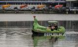 Sejumlah pengunjung menaiki perahu saat berwisata di Taman Mini Indonesia Indah (TMII) Jakarta, Sabtu (24/10). Sejak beroperasi pada PSBB transisi kedua, TMII hanya dikunjungi sekitar 1.000 orang pada hari biasa dan 3.000 hingga 7.000 orang pada akhir pekan. Jumlah tersebut masih jauh dari kapasitas maksimal 25 persen berkisar 15.000 sampai 20.000 orang yang diduga akibat faktor masih tingginya angka penularan Covid-19. Republika/Putra M. Akbar (FOTO : Republika/Putra M. Akbar)
