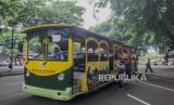 Sejumlah pengunjung menaiki mobil wisata di Taman Mini Indonesia Indah (TMII) Jakarta, Sabtu (24/10). Sejak beroperasi pada PSBB transisi kedua, TMII hanya dikunjungi sekitar 1.000 orang pada hari biasa dan 3.000 hingga 7.000 orang pada akhir pekan. Jumlah tersebut masih jauh dari kapasitas maksimal 25 persen berkisar 15.000 sampai 20.000 orang yang diduga akibat faktor masih tingginya angka penularan Covid-19. Republika/Putra M. Akbar (FOTO : Republika/Putra M. Akbar)