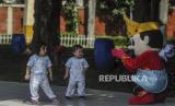 Badut menghibur anak-anak yang mengunjungi Taman Mini Indonesia Indah (TMII) Jakarta, Sabtu (24/10). Sejak beroperasi pada PSBB transisi kedua, TMII hanya dikunjungi sekitar 1.000 orang pada hari biasa dan 3.000 hingga 7.000 orang pada akhir pekan. Jumlah tersebut masih jauh dari kapasitas maksimal 25 persen berkisar 15.000 sampai 20.000 orang yang diduga akibat faktor masih tingginya angka penularan Covid-19. Republika/Putra M. Akbar (FOTO : Republika/Putra M. Akbar)