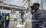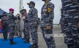 Sejumlah prajurit memberikan penghormatan kepada Komandan Pangkalan Utama TNI Angkatan Laut (Danlantamal) I Brigjen TNI (Mar) I Made Wahyu Santoso (tengah) usai meninjau KRI Bima Suci yang tiba di Pelabuhan Belawan, Medan, Sumatera Utara, Sabtu (24/10/2020). KRI Bima Suci-945 yang merupakan kapal layar latih bagi taruna/kadet aal itu bersandar selama tiga hari di Medan untuk melaksanakan sejumlah kegiatan dalam mendukung latihan praktek (Lattek) Kartika Jala Krida (KJK) 2020. (FOTO : ADITYA PRADANA PUTRA/ANTARA)