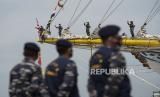 Sejumlah Taruna AAL tingkat III angkatan ke-67 mengikuti parade roll di atas KRI Bima Suci-945 saat tiba di Pelabuhan Belawan, Medan, Sumatera Utara, Sabtu (24/10/2020). KRI Bima Suci-945 yang merupakan kapal layar latih bagi taruna/kadet aal itu bersandar selama tiga hari di Medan untuk melaksanakan sejumlah kegiatan dalam mendukung latihan praktek (Lattek) Kartika Jala Krida (KJK) 2020. (FOTO : ADITYA PRADANA FOTO PUTRA/ANTARA )