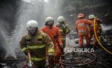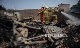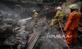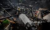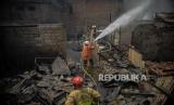 Petugas pemadam kebakaran melakukan proses pendinginan di lokasi kebakaran Jalan Simprug Golf, Grogol Selatan, Kebayoran Lama, Jakarta Selatan, Senin (26/10). Kebakaran tersebut terjadi sekitar pukul 07.57 diduga akibat korsleting listrik yang menyebabkan sebanyak 25 rumah hangus terbakar. Republika/Thoudy Badai (FOTO : Republika/Thoudy Badai)