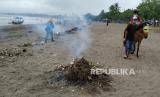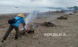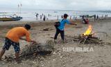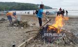 Warga membantu petugas kebersihan membakar sampah yang terbawa arus laut termasuk yang dibuang pengunjung, di Pantai Pangandaran, Kabupaten Pangandaran, Sabtu (24/10). Arus laut yang cukup tinggi di saat musim hujan membawa bermacam sampah dari tengah laut ke daratan. (FOTO : Edi Yusuf/Republika)