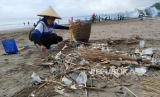 REPUBLIKA.CO.ID, PANGANDARAN -- Petugas kebersihan pantai membersihkan sampah yang terbawa arus laut termasuk yang dibuang pengunjung, di Pantai Pangandaran, Kabupaten Pangandaran, Sabtu (24/10). Arus laut yang cukup tinggi di saat musim hujan membawa bermacam sampah dari tengah laut ke daratan.