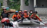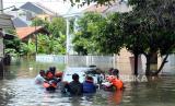 Petugas Polmas dan BPBD Kota Bogor mengevakuasi warga yang rumahnya terendam banjir di Perumahan Griya Cimanggu Indah, Kelurahan Kedung Badak, Tanah Sareal, Kota Bogor, Jawa Barat, Senin (26/10/2020). Hujan deras dengan intensitas tinggi yang terjadi di wilayah Bogor pada Sabtu (24/10/2020) tersebut menyebabkan 17 rumah di perumahan tersebut terendam banjir luapan sungai Ciliwung dengan ketinggian 50 sentimeter hingga satu meter akibat tanah longsor yang menutupi saluran air drainase. (FOTO : ANTARA/ARIF FIRMANSYAH)