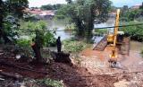 Petugas Dinas Bina Marga dan Sumber Daya Air Kota Bogor menggunakan alat berat untuk mengeruk tanah longsor yang menutupi saluran air drainase penyebab banjir di Perumahan Griya Cimanggu Indah, Kelurahan Kedung Badak, Tanah Sareal, Kota Bogor, Jawa Barat, Senin (26/10/2020). Hujan deras dengan intensitas tinggi yang terjadi di wilayah Bogor pada Sabtu (24/10/2020) tersebut menyebabkan 17 rumah di perumahan tersebut terendam banjir luapan sungai Ciliwung dengan ketinggian 50 sentimeter hingga satu meter akibat tanah longsor yang menutupi saluran air drainase. (FOTO : ARIF FIRMANSYAH/ANTARA )
