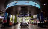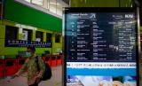 Calon penumpang menunggu jadwal keberangkatan kereta api di Stasiun Gambir, Jakarta, Senin (26/10/2020). PT Kereta Api Indonesia (Persero) sampai dengan 25 Oktober 2020 telah menjual 83 ribu tiket untuk libur cuti bersama periode keberangkatan 27 Oktober sampai dengan 1 November 2020 atau setara dengan 37 persen dari total?tiket yang disediakan. (FOTO : Antara/Dhemas Reviyanto)