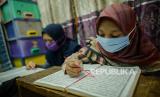 Virni (12) belajar mengaji di rumahnya di kawasan Jati Padang, Jakarta, Senin (26/10). Selama pandemi Covid-19 akitivitas mengaji masih dilakukan di rumah dengan menerapkan protokol kesehatan seperti menggunakan masker, mengingat Taman Pendidikan Al-Quran belum dibuka kembali. (FOTO : Republika/Thoudy Badai)