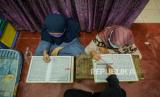 Tri Handyani (18) mengajar ngaji tetangganya di rumahnya di kawasan Jati Padang, Jakarta, Senin (26/10). Selama pandemi Covid-19 akitivitas mengaji masih dilakukan di rumah dengan menerapkan protokol kesehatan seperti menggunakan masker, mengingat Taman Pendidikan Al-Quran belum dibuka kembali. (FOTO : Republika/Thoudy Badai)