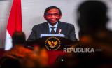 Menkopolhukam Mahfud MD memberikan sambutan secara virtual pada seminar Internasional season 1 yang diselenggarakan oleh Badan Pembinaan Ideologi Pancasila (BPIP) bekerjasama Dengan Gerakan Pemuda (GP) Ansor di Jakarta, Rabu (28/10). Seminar Internasional tersebut diselenggarakan dalam rangka memperingati Hari Santri Nasional dan hari Sumpah Pemuda. (FOTO : Republika/Putra M. Akbar)