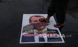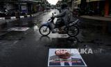 REPUBLIKA.CO.ID, JAKARTA -- Pengendara melintas di atas poster berwajah presiden Prancis Emmanuel Macron yang ditempel di simpang Jalan Kauman, Yogyakarta, Rabu (28/10).