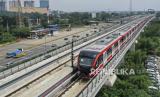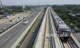 Kereta api ringan (LRT) berada di lintasan LRT Jabodebek Cawang-Cibubur di Cibubur, Jakarta, Kamis (29/10/2020). Pihak operator konstruksi LRT Jabodebek Cawang-Cibubur telah memulai tahapan uji coba (FOTO : Hafidz Mubarak A/ANTARA FOTO)