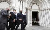 Presiden Emmanuel Macron dan sejumlah pejabat mendatangi Gereja Notre Dame, Nice, Perancis Selatan, Kamis (29/10). (FOTO : Pool Reuters/Eric Gaillard/Pool via AP)