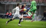 Rade Krunic (tengah) menembakkan bola yang diadang kiper Sparta Milan Heca (kanan), pada laga Liga Europa Group H antara AC Milan melawan Sparta Praha di San Siro Stadium, Milan, Italia. (FOTO : AP/Antonio Calanni)