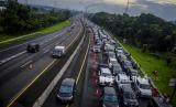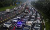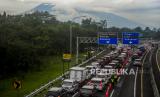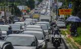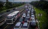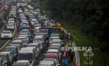 Sejumlah kendaraan mengantre menunggu jalan untuk dibuka saat diberlakukan sistem one way di akses keluar Tol Jagorawi, Gadog, Kabupaten Bogor, Jawa Barat, Jumat (30/10). Hari ketiga libur cuti bersama dan Maulid Nabi Muhammad SAW arus lalu lintas kawasan wisata puncak terpantau ramai lancar dan masih diberlakukan sistem one way untuk mengurai kepadatan kendaraan. (FOTO : Republika/Putra M. Akbar)