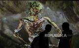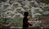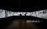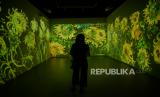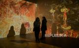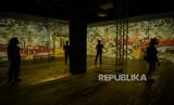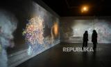 Pengunjung memerhatikan karya maestro lukis Affandi melalui video mapping di Galeri Nasional Indonesia, Jakarta, Jumat (30/10). Pameran bertajuk Imersif Affandi Alam, Ruang, Manusia tersebut digelar secara daring dan luring dalam rangkaian acara Pekan Kebudayaan Nasional (PKN) 2020 yang berlangsung hingga 25 November 2020. (FOTO : Republika/Thoudy Badai)