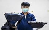 Pemilik usaha tas Newlight Bags Reza Dwi Alamsyah menunjukkan tas model waistbag di rumah produksi Newlight Bags, Jalan Pesantren, Cibabat, Kota Cimahi, Jumat (30/10). Berbagai macam model tas yang dijual dengan harga Rp220 ribu sampai Rp1,3 juta tergantung jenis bahan dan model tersebut telah menembus pasar ekspor di Singapura, Malaysia dan Rusia serta dijual ke berbagai kota di Indonesia. Foto: Abdan Syakura/Republika (FOTO : ABDAN SYAKURA/REPUBLIKA)