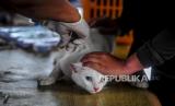 Petugas menyuntikan vaksin anti rabies kepada kucing di kawasan Tebet, Jakarta, Sabtu (31/10). Pemberian vaksin gratis tersebut untuk menghindari dan mengantisipasi penyebaran penyakit rabies kepada hewan peliharaan. (FOTO : Republika/Putra M. Akbar)