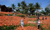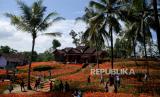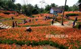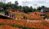 Pengunjung berjalan-jalan di Taman Bunga Amarilis Sukadi, Pathuk, Gunungkidul, Yogyakarta, Ahad (1/11). Wisatawan bisa berswafoto atau berjalan-jalan di tengah kebun bunga Amarilis yang mekar. Di tanah 5 hektare Sukadi membudidayakan bunga Amarilis, dan bunga ini mekar setahun sekali. Dengan tiket masuk Rp 10 ribu pengunjung bisa memasuki taman berwarna merah. (FOTO : Wihdan Hidayat / Republika)