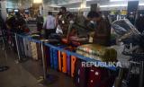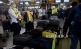 Petugas tour n travel merapikan koper milik calon jamaah umroh di Terminal 3 Bandara Soekarno Hatta, Tangerang, Banten, Ahad (1/11). Ratusan jamaah diberangkatkan ke tanah suci pada Ahad (1/11). Hal ini merupakan pemberangkatan perdana setelah umroh ditutup pada februari akibat pandemi Covid-19. (FOTO : Prayogi/Republika)