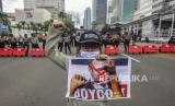 REPUBLIKA.CO.ID, JAKARTA -- Sejumlah massa aksi yang tergabung dalam Aliansi Umat Islam menunjukan poster saat melakukan unjuk rasa di Jalan MH Thamrin, Jakarta, Senin (2/11).