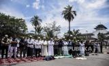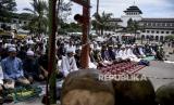 Sejumlah massa dari berbagai organisasi islam menunaikan ibadah Sholat Dzuhur saat Rapat Akbar Umat Islam Jabar di depan Gedung Sate, Jalan Diponegoro, Kota Bandung, Rabu (4/11). Rapat akbar tersebut dalam rangka persiapan penyambutan Imam Besar Front Pembela Islam (FPI) Muhammad Rizieq Shihab yang rencananya akan tiba di Indonesia pada 10 November mendatang. Foto: Abdan Syakura/Republika (FOTO : ABDAN SYAKURA/REPUBLIKA)
