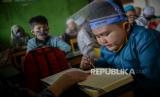 Anak berlajar mengaji di salah satu Taman Pendidikan Al-Quran di kawasan Mampang Prapatan, Jakarta, Rabu (4/11). Kegiatan mengaji tersebut dilakukan dengan menerapkan protokol kesehatan seperti penggunaan masker, menjaga jarak dan pembagian jam belajar dari pukul 08.00 - 17.00 yang dibagi menjadi empat kelas sebagai upaya mengantisipasi penyebaran Covid-19. Republika/Thoudy Badai (FOTO : Republika/Thoudy Badai)