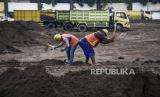 Pekerja menyelesaikan proyek renovasi Stadion Sidolig, Kota Bandung, Kamis (5/11). Kementerian PUPR menargetkan proyek renovasi Stadion Sidolig yang menjadi salah satu stadion tempat latihan Piala Dunia U-20 rampung pada Maret 2021. Foto: Abdan Syakura/Republika (FOTO : ABDAN SYAKURA/REPUBLIKA)