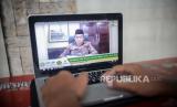 Warga mendengarkan pemaparan Menteri Agama RI Fahrul Razi saat kegiatan webinar dan peluncuran strategi kerjasama antara Islamic Development Bank bersama Badan Amil Zakat Nasional melalui siaran langsung youtube di Jakarta, Kamis (5/11). Dalam acara tersebut membahas tentang membuka potensi zakat untuk mngurangi angka kemiskinan dan Covid-19. (FOTO : Republika/Thoudy Badai)