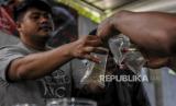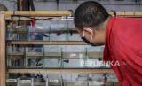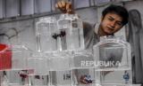 Pedagang memberi makan ikan cupang pada Pameran dan Bazaar Cupang di Pasar Gembrong Baru Cipinang, Jakarta, Kamis (5/11). Pameran dan bazaar yang berlangsung hingga Senin (30/11) itu menampilkan beragam jenis ikan cupang (Betta sp) dengan harga jual mulai Rp35 ribu hingga jutaan rupiah. (FOTO : Republika/Putra M. Akbar)