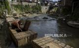Warga membersihkan sampah yang menyangkut di keramba budi daya ikan di aliran Sungai Cikapundung, Bandung, Jawa Barat, Jumat (6/11/2020). Sejumlah warga di kawasan bantaran Sungai Cikapundung tersebut membudi dayakan ikan mas menggunakan keramba dari bambu sebagai pemanfaatan aliran sungai untuk menambah penghasilan. (FOTO : ANTARA/Novrian Arbi)