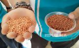 Petugas Dinas Pertanian menunjukkan perbedaan pupuk NPK asli yang berwarna cerah (kiri) dengan pupuk NPK diduga palsu yang berwarna lebih gelap (kanan) dengan wadah merek dagang pupuk bersubsidi Phonska di wilayah Tanggunggunung, Tulungagung, Jawa Timur, Jumat (6/11/2020). Peredaran pupuk NPK diduga palsu yang dijual di kisaran harga Rp170 ribu hingga Rp190 ribu per sak karung isi 50 kg itu diketahui petani setempat setelah sepekan digunakan memupuk ladang jagung dan menyebabkan tanaman layu dan menguning. (FOTO : ANTARA/Destyan Sujarwoko)