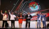 Pasangan calon Wali Kota dan Wakil Wali Kota Medan nomor urut satu Akhyar Nasution-Salman Alfarisi (kiri) dan nomor urut dua Bobby Nasution-Aulia Rahman (kanan) menyapa penonton usai mengikuti Debat Publik perdana Pemilihan Kepala Daerah (Pilkada) calon Wali Kota dan Wakil Wali Kota Medan di Medan, Sumatera Utara, Sabtu (7/11/2020). Debat Publik perdana yang diselenggarakan Komisi Pemilihan Umum (KPU) Kota Medan tersebut membahas mengenai Kesejahteraan Masyarakat dan Memajukan Daerah. ANTARA FOTO/Adiva Niki/Lmo/wsj. (FOTO : ANTARA FOTO/ADIVA NIKI)