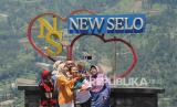 Sejumlah pengunjung berswafoto di kawasan wisata lereng Gunung Merapi, New Selo, Selo, Boyolali, Jawa Tengah, Sabtu (7/11/2020). Meskipun status Gunung Merapi pada Siaga III, destinasi wisata yang berada di lereng Gunung Merapi itu tetap buka.  (FOTO : Antara/Aloysius Jarot Nugroho)