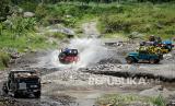 Sejumlah wisatawan menggunakan jasa Jeep Lava Tour Merapi di kawasan Kalikuning, Cangkringan, Sleman, D.I Yogyakarta, Sabtu (7/11/2020). Saat ini Jeep Lava Tour Merapi tetap beroperasi dengan rute di luar zona lima km dari puncak Gunung Merapi menyusul naiknya status Gunung Merapi dari Waspada (level II) menjadi Siaga (level III). (FOTO : Antara/Andreas Fitri Atmoko)