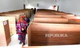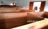 Bilik pengungsi dengan ukuran 1,5x2 meter disiapkan dalam gedung barak pengungsian di lapangan Balai Desa Glagaharjo, Cangkringan, Sleman, Yogyakarta, Ahad (8/11). Sekitar 80an bilik pengungsi sudah disiapkan untuk penduduk rentan Desa Kalitengah Lor. Sebanyak 164 jiwa sudah mengisi barak pengungsian, dan untuk cadangan sudah disiapkan di SD Muhammadiyah Cepitsari. Penduduk rentan sudah mulai dievakuasi menuju pengungsian sejak kenaikan status Siaga Gunung Merapi. (FOTO : Wihdan Hidayat / Republika)