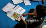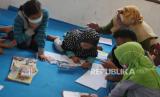 REPUBLIKA.CO.ID, YOGYAKARTA -- Anak-anak belajar bersama relawan di Barak Pengungsian Desa Glagaharjo, Cangkringan, Sleman, Yogyakarta, Senin (9/11).