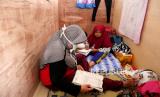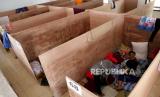 Anak-anak belajar bersama ibunya di bilik Barak Pengungsian Desa Glagaharjo, Cangkringan, Sleman, Yogyakarta, Senin (9/11). Meski di pengungsian, anak-anak Kalitengah Lor harus tetap belajar dan mengerjakan tugas secara daring. Anak-anak termasuk penduduk rentan harus mengungsi imbas kenaikan status Siaga Gunung Merapi. (FOTO : Wihdan Hidayat / Republika)