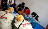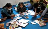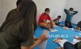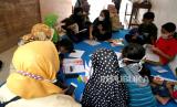 Anak-anak belajar bersama relawan di Barak Pengungsian Desa Glagaharjo, Cangkringan, Sleman, Yogyakarta, Senin (9/11). Meski di pengungsian, anak-anak Kalitengah Lor harus tetap belajar dan mengerjakan tugas secara daring. Anak-anak termasuk penduduk rentan harus mengungsi imbas kenaikan status Siaga Gunung Merapi. (FOTO : Wihdan Hidayat / Republika)