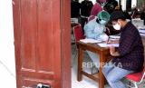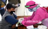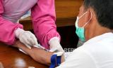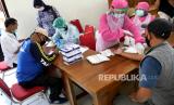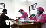 Petugas dari Puskesmas Cangkringan melakukan rapid test bagi relawan di Barak Pengungsian Penduduk Rentan, Balai Desa Glagaharjo, Cangkringan, Sleman, Yogyakarta, Senin (9/11). Rapid test ini ditargetkan untuk 60 relawan yang akan bertugas di barak pengungsian. Dan juga untuk wartawan yang bertugas di wilayah Glagaharjo. Ini dilakukan untuk mencegah dna menghindari penularan Covid-19 di area pengungsian. (FOTO : Wihdan Hidayat / Republika)