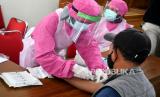 Petugas dari Puskesmas Cangkringan mengambil sampel darah saat rapid test bagi relawan di Barak Pengungsian Penduduk Rentan, Balai Desa Glagaharjo, Cangkringan, Sleman, Yogyakarta, Senin (9/11). Rapid test ini ditargetkan untuk 60 relawan yang akan bertugas di barak pengungsian. Dan juga untuk wartawan yang bertugas di wilayah Glagaharjo. Ini dilakukan untuk mencegah dna menghindari penularan Covid-19 di area pengungsian. (FOTO : Wihdan Hidayat / Republika)