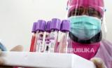 Petugas dari Puskesmas Cangkringan menunjukkan sampel darah saat melakukan rapid test bagi relawan di Barak Pengungsian Penduduk Rentan, Balai Desa Glagaharjo, Cangkringan, Sleman, Yogyakarta, Senin (9/11). Rapid test ini ditargetkan untuk 60 relawan yang akan bertugas di barak pengungsian. Dan juga untuk wartawan yang bertugas di wilayah Glagaharjo. Ini dilakukan untuk mencegah dna menghindari penularan Covid-19 di area pengungsian. (FOTO : Wihdan Hidayat / Republika)