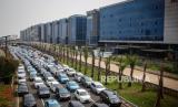 REPUBLIKA.CO.ID, BANTEN -- Sejumlah kendaraan terjebak macet di Tol Bandara Soekarno Hatta (Soetta), Tangerang, Banten, Selasa (10/11). Kemacetan tersebut diakibatkan penumpukan massa di daerah Tol Bandara saat penyambutan kedatangan Habib Rizieq Shihab (HRS).