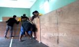 Warga membangun bilik pengungsi di Barak Pengungsian Wonokerto, Sleman, Yogyakarta, Senin (10/11). Sekitar 20 bilik berukuran 2x2 meter sedang dibangun untuk persiapan pengungsi kelompok rentan. Selain bilik, juga sudah disiapkan tenda untuk pengungsi tambahan. Namun, saat ini belum ada warga yang mengisi barak pengungsian Wonokerto. (FOTO : Wihdan Hidayat / Republika)