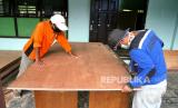 Warga memotong kayu untuk bilik pengungsi di Barak Pengungsian Wonokerto, Sleman, Yogyakarta, Senin (10/11). Sekitar 20 bilik berukuran 2x2 meter sedang dibangun untuk persiapan pengungsi kelompok rentan. Selain bilik, juga sudah disiapkan tenda untuk pengungsi tambahan. Namun, saat ini belum ada warga yang mengisi barak pengungsian Wonokerto. (FOTO : Wihdan Hidayat / Republika)