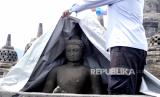 Petugas Balai Konservasi Borobudur (BKB) menutup stupa dengan menggunakan terpal di Candi Borobudur, Magelang, Jawa Tengah, Kamis (12/11). Penutupan stupa dan lantai Candi Borobudur untuk mengantisipasi abu vulkanis jika terjadi erupsi Gunung Merapi. Langkah ini diambil menyusul peningkatan status Siaga dan aktivitas vulkanik Merapi. Penutupan ini dilakukan secara bertahap, saat ini sudah ada 32 stupa di lantai 8 yang sudah ditutup terpal. Dan yang lain mengikuti perkembangan aktivitas Gunung Merapi. (FOTO : Wihdan Hidayat / Republika)